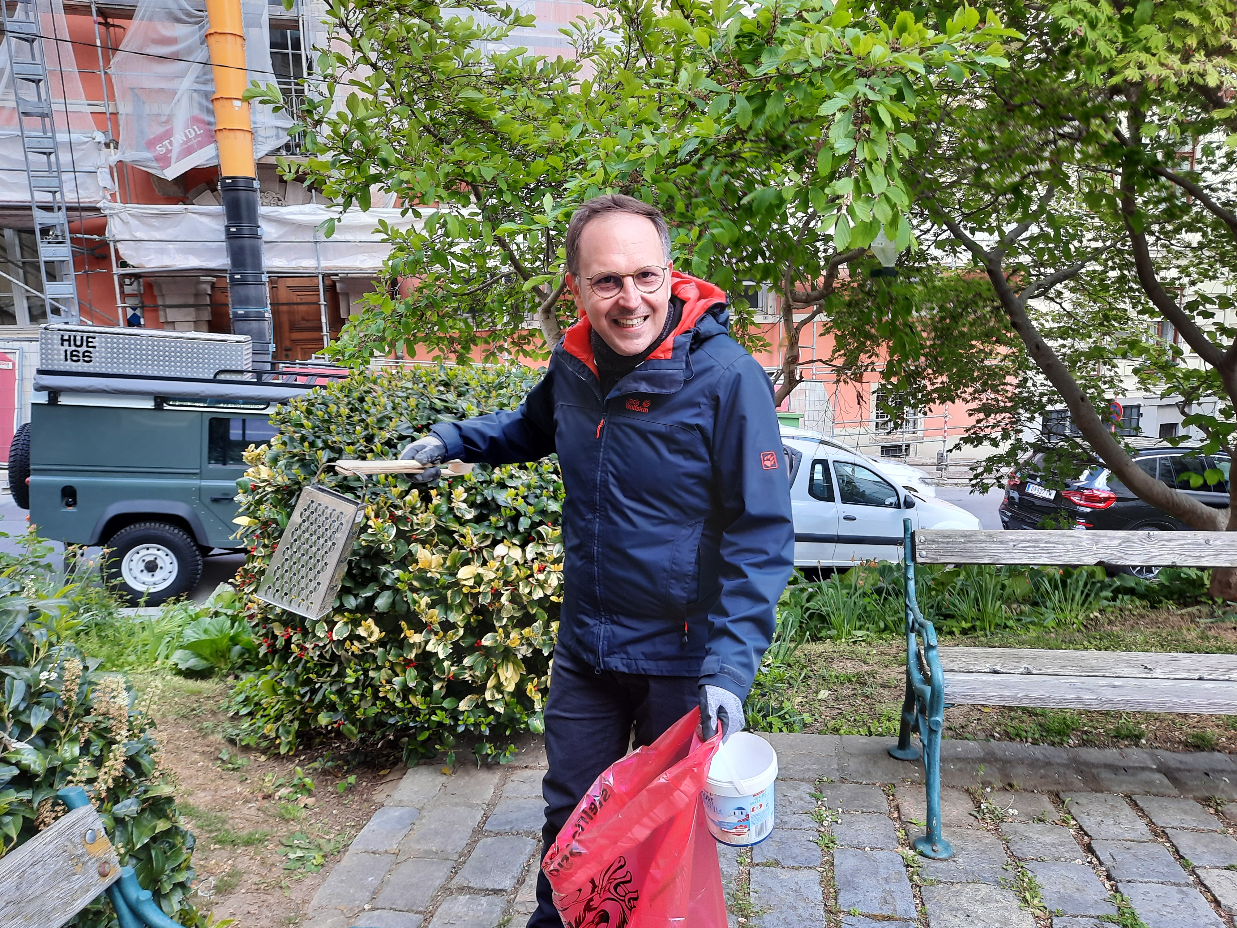Zangen und Müllsäcke im Kircheneck ausborgen