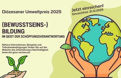 (BEWUSSTSEINS-)BILDUNG im Geist der SchöpfungsverantwortungMachen Sie mit beim Diözesanen Umweltpreis 2025 der Diözese Graz-Seckau! Gesucht sind Veranstaltungen und Initiativen, bei denen...