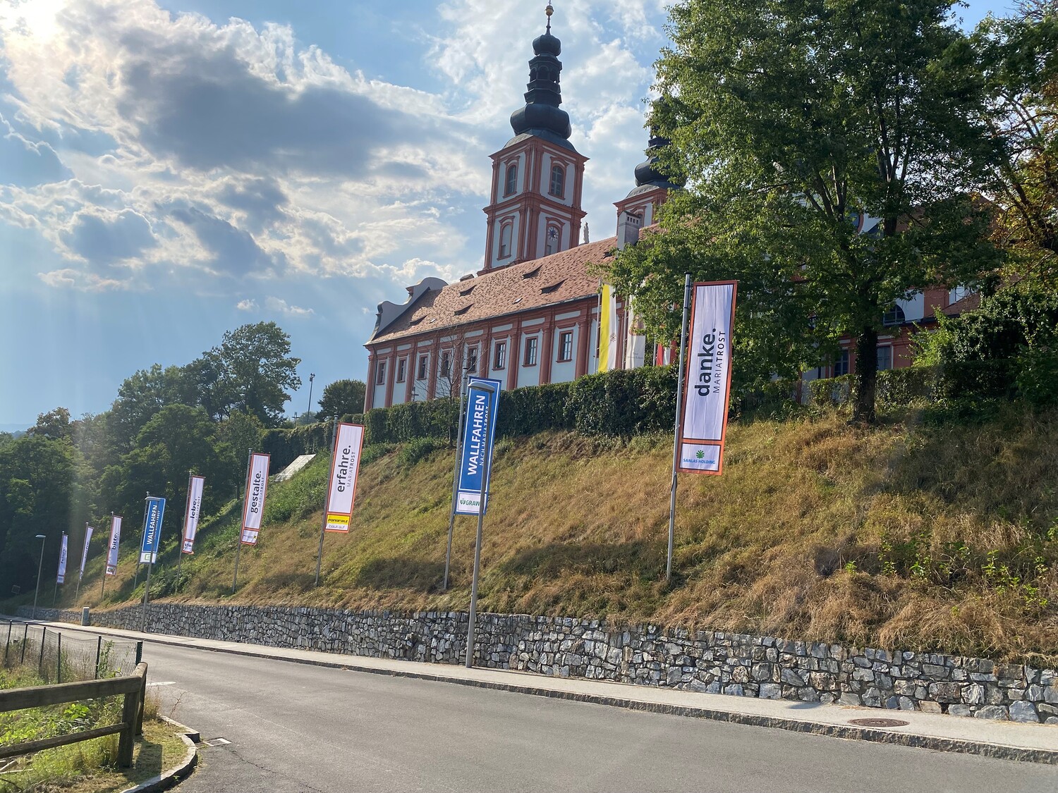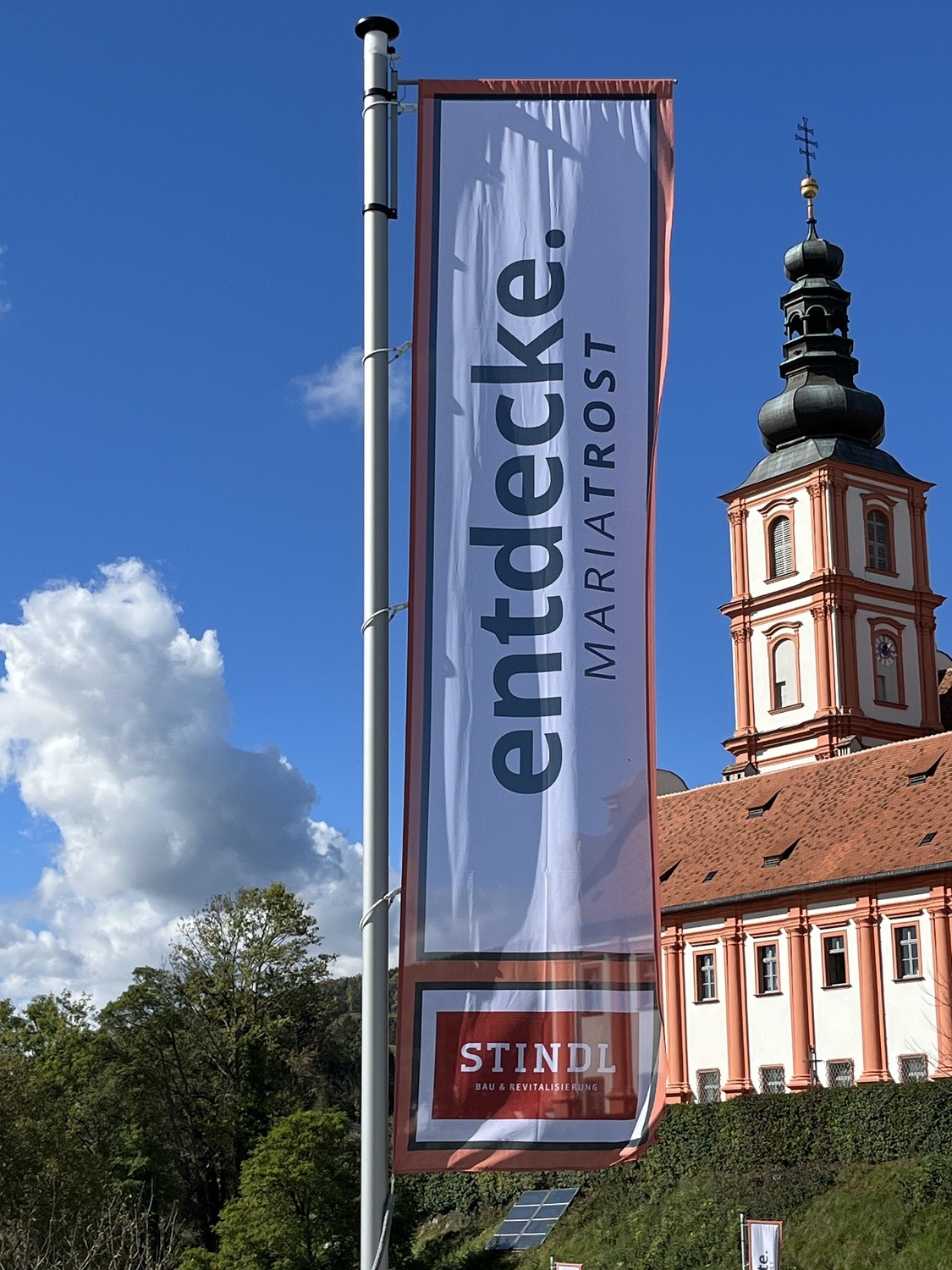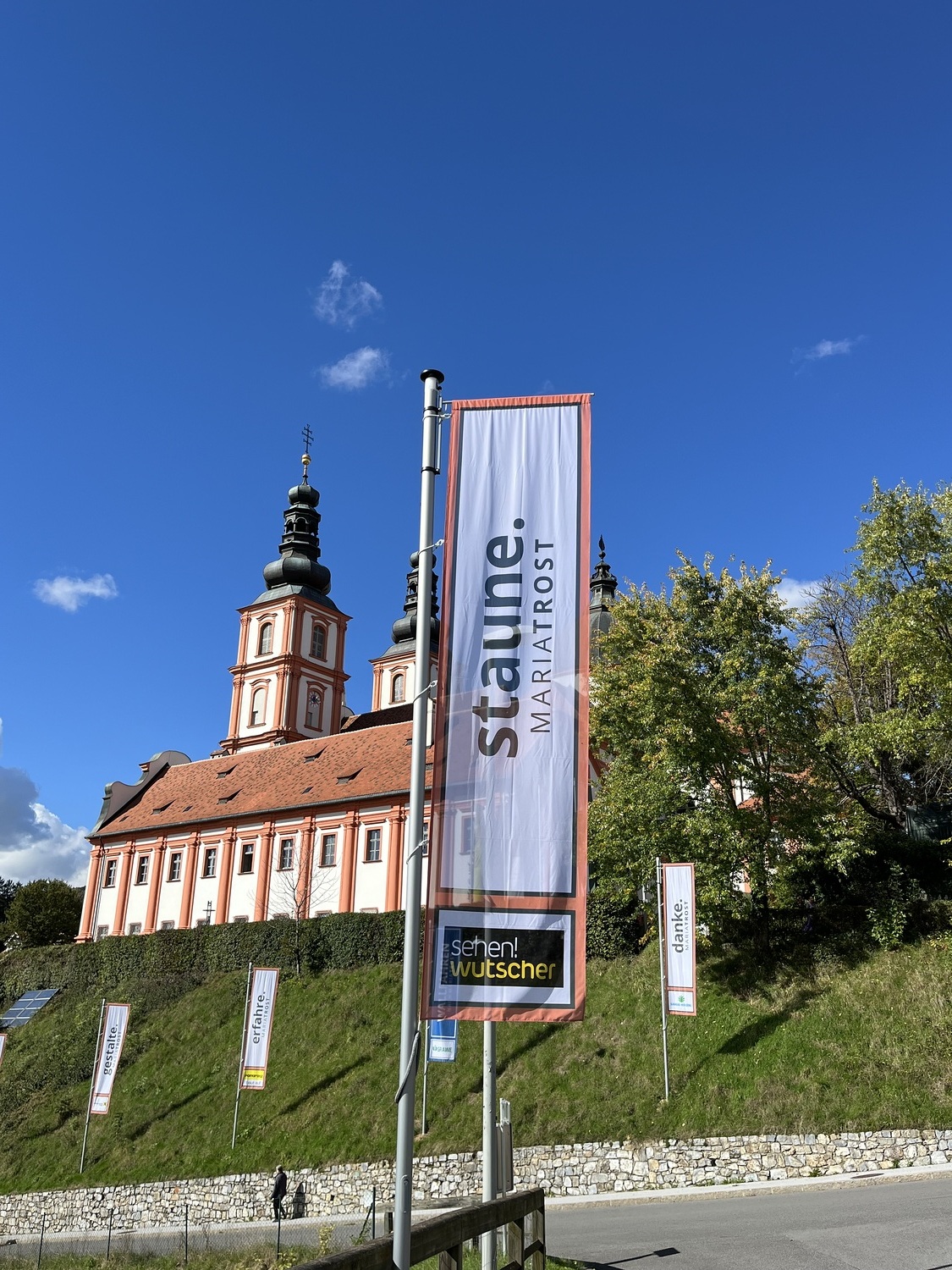 15 Unternehmen und Institutionen helfen – optisch fein sichtbar gemacht durch 18 Fahnen – mit, auf die Tiefenwirkungen von MARIATROST aufmerksam zu machen: 4 THEMEN-Fahnen stimmen die Besuchenden auf das Kirchenjahr ein und 14 SPONSORING-Fahnen signalisieren die verlässliche Projektbegleitung durch die Sponsoren.