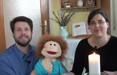 Barbara und Günter gestalten gemeinsam mit Handpuppe Martin eine Kinderkreuzweg-Andacht.